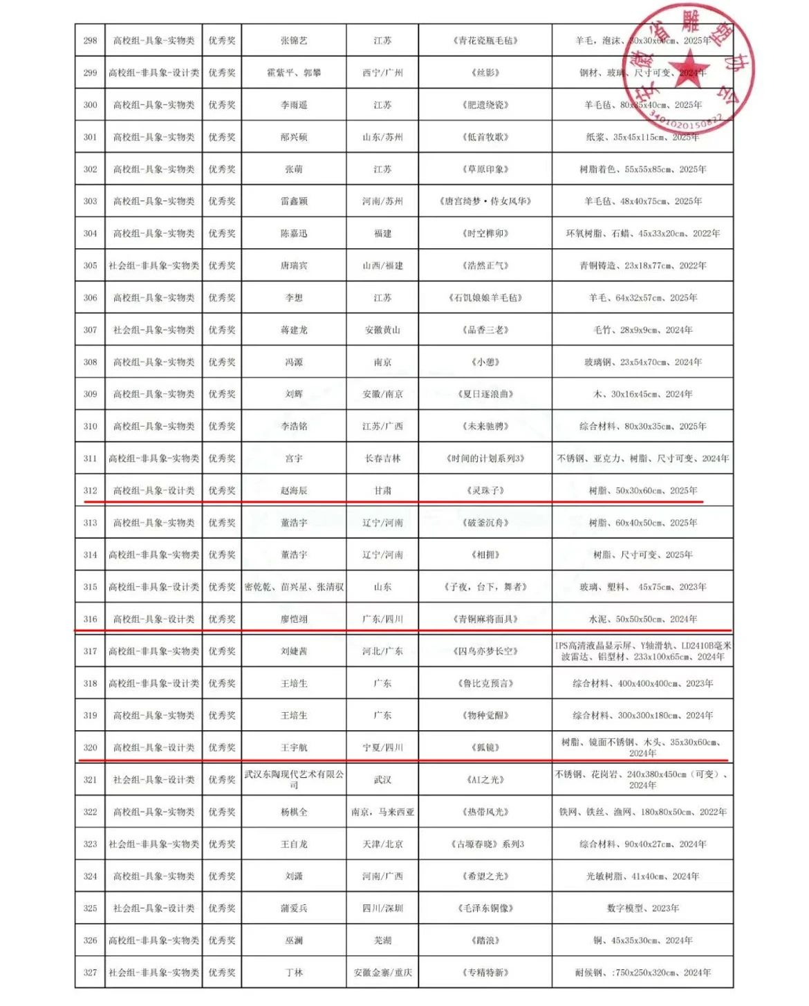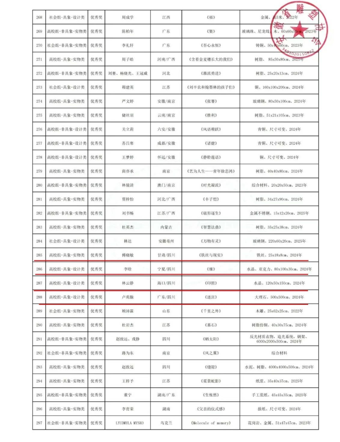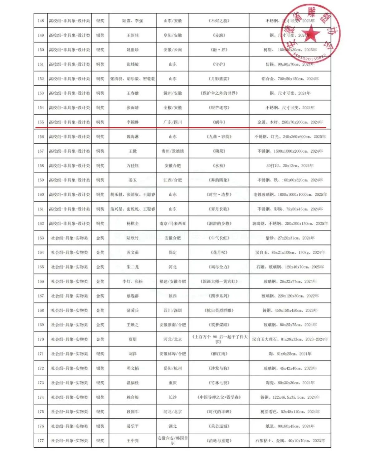 在本次大赛中,我院精心筹备,共投稿作品14件。公共艺术专业师生在此次赛事中表现卓越、成绩斐然,交出了一份令人瞩目的答卷。其中,教师团队凭借深厚的专业素养和出色的创作能力,一举斩获金奖1项、银奖1项,同时,团队中有3位老师凭借对学生悉心的指导与卓越的贡献,被评为本次比赛的“优秀指导教师”。学生方面同样表现出色,荣获铜奖3项、优秀奖9项。这些沉甸甸的奖项,不仅是对师生个人创作能力的充分肯定,更是美术设计学院公共艺术专业多年来坚持高质量教学、注重培养学生艺术素养和创新能力的成果彰显,是对专业教学成果的一次全面且充分的展示。
