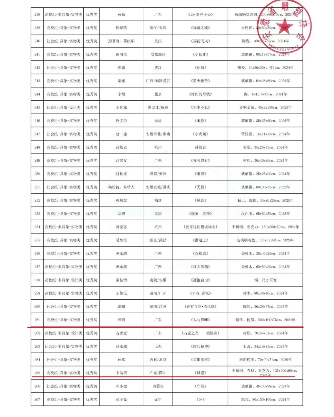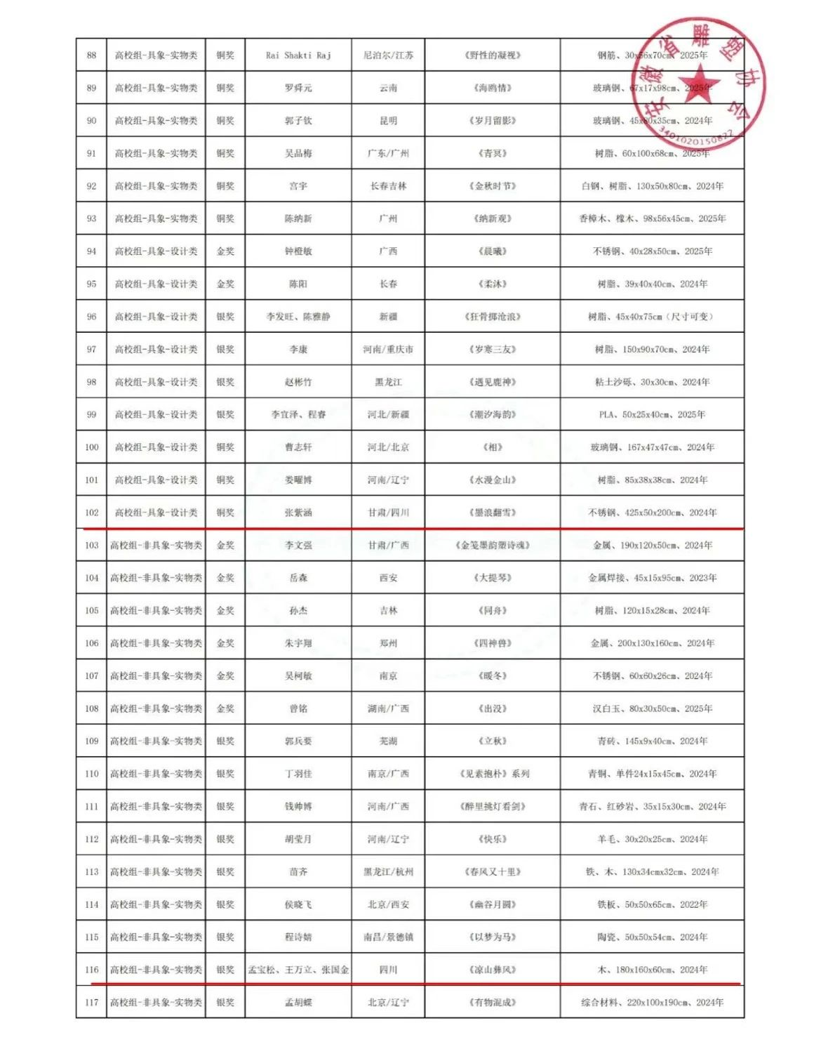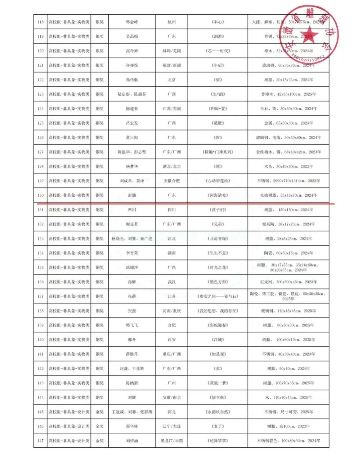 在本次大赛中,我院精心筹备,共投稿作品14件。公共艺术专业师生在此次赛事中表现卓越、成绩斐然,交出了一份令人瞩目的答卷。其中,教师团队凭借深厚的专业素养和出色的创作能力,一举斩获金奖1项、银奖1项,同时,团队中有3位老师凭借对学生悉心的指导与卓越的贡献,被评为本次比赛的“优秀指导教师”。学生方面同样表现出色,荣获铜奖3项、优秀奖9项。这些沉甸甸的奖项,不仅是对师生个人创作能力的充分肯定,更是美术设计学院公共艺术专业多年来坚持高质量教学、注重培养学生艺术素养和创新能力的成果彰显,是对专业教学成果的一次全面且充分的展示。