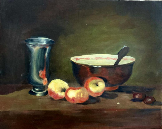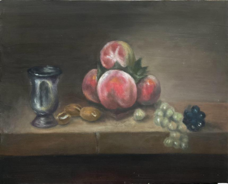 临摹夏尔丹《桃子、银酒、葡萄和胡桃》油画40×50cm