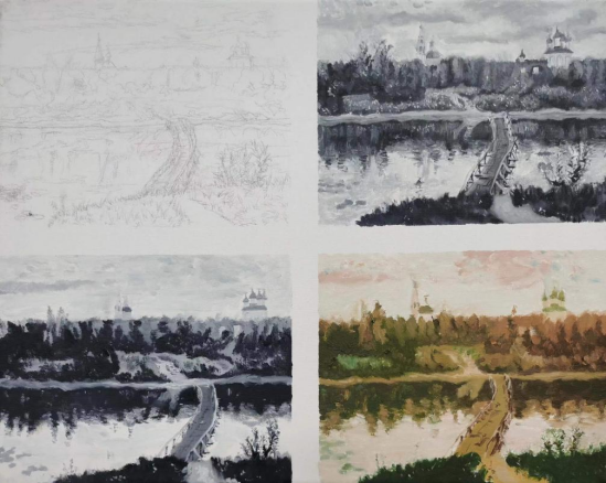 学习心得:掌握古典油画技法,关键在于掌握熟悉古典油画的步骤和方法,做底是关键,在胶底上做好“红底”(油底),然后干透后,再按步骤从色块到面,刷油照染,逐渐丰富画面,用油的比例要随着画面的深入而增加