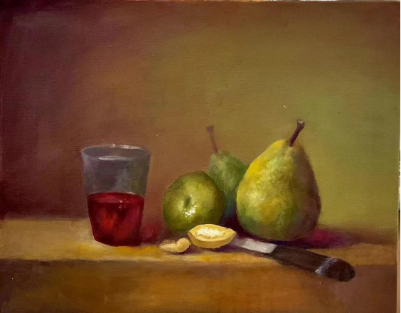 学习心得:通过老师的讲解和演示,了解并学会了古典油画是怎么画的,完成了两幅作品,经过一遍遍的重复上油上色,不断完善,呈现出最终的作品,以及创作作品从结构,颜色和取舍上挑选。课下付出足够的时间去将细节不断补充,对画面的塑造,提升了自己的能力。