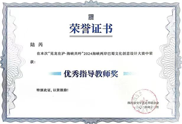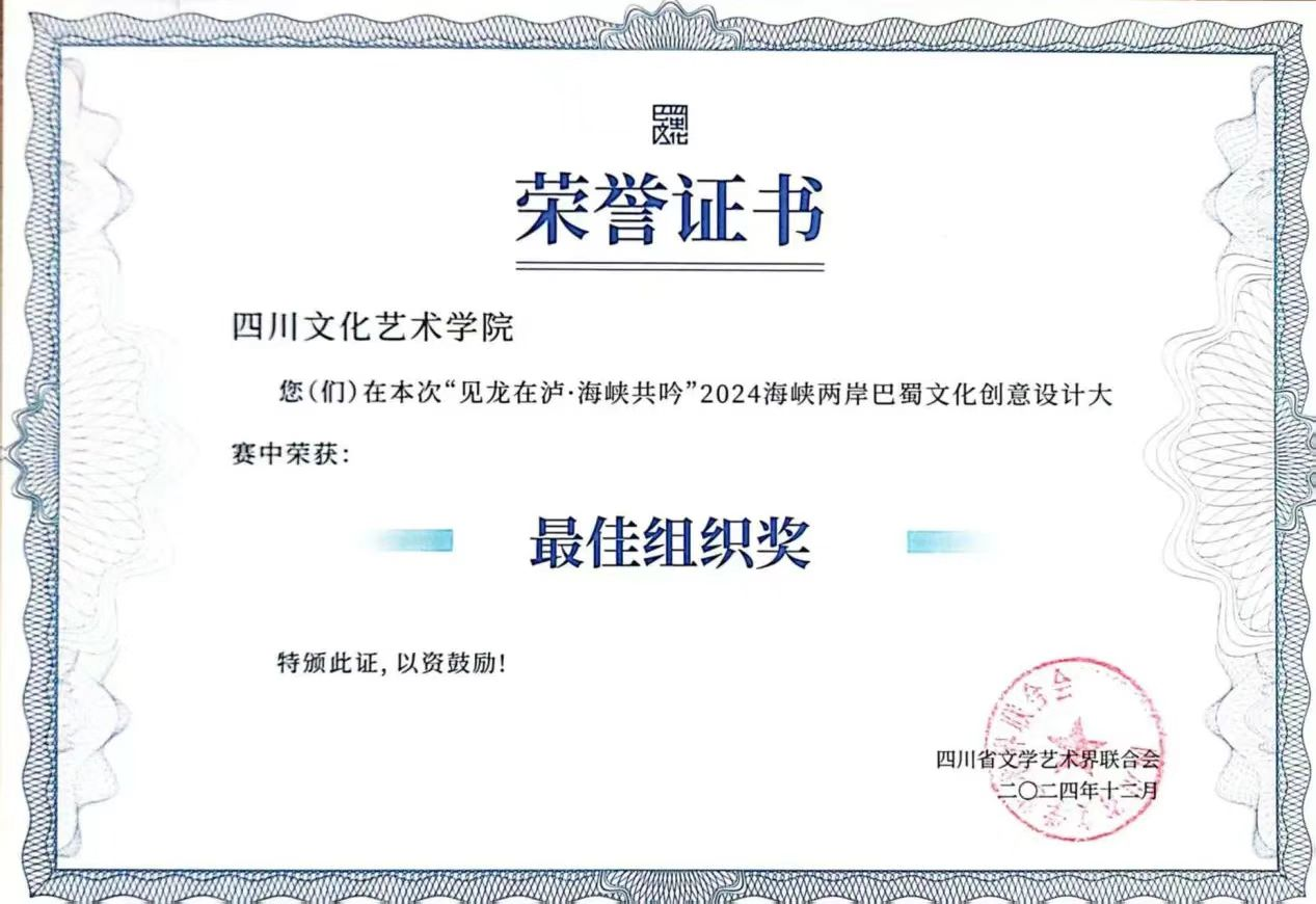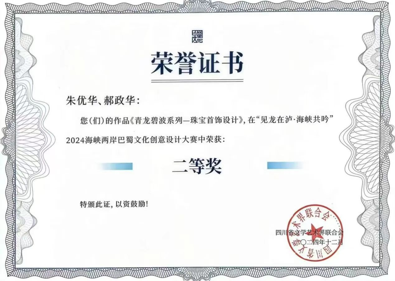 赛事由四川省人民政府台湾事务办公室、四川省教育厅、四川省文化和旅游厅、四川省文学艺术界联合会主办,来自82余所院校参与,征集到1200余件作品,经过多轮角逐和严格评审,共评选出获奖项目:一等奖1名,二等奖2名,三等奖3名,优秀奖30名。美术设计学院积极备战组织投稿,2021级视觉传达设计专业本科4班的朱优华、郝政华同学,提交的设计作品《青龙碧波系列——珠宝首饰设计》喜获“二等奖”,美术设计学院视觉传达设计专业教师魏艳、闫沐涵、韩美仪、陆芮荣获“优秀指导教师奖”,同时四川文化艺术学院获得“最佳组织奖”。巴蜀文化创意大赛是海峡两岸巴蜀文化艺术季子活动之一,致力于海峡两岸文化艺术交流合作发展。