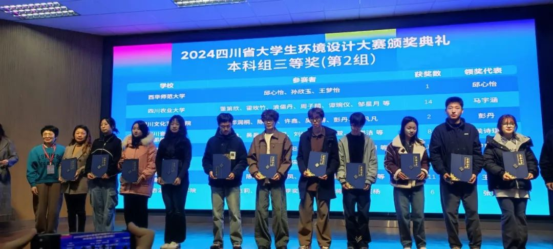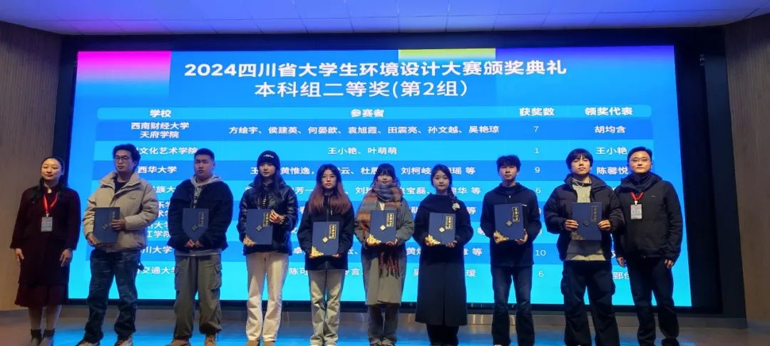 2024年11月24日,由四川省教育厅主办,西南交通大学承办,中国民主同盟四川省委员会、中国建筑装饰协会、四川省高等教育学会,中国建筑学会室内设计分会、中国建筑第四工程局有限公司为指导单位,联合民盟成都市委员会、四川省普通本科高等学校设计类专业教学指导委员会、四川省高等教育学会设计专业委员会、中建四局四川建设有限公司、成都市建筑装饰协会协办的“2024四川省大学生环境设计大赛”在西南交通大学落下帷幕。本次大赛43所高校齐聚一堂,投稿件数上千余件。经过激烈的角逐,我院师生多个参赛作品脱颖而出,荣获二等奖1项、三等奖2项,命题组三等奖1项,学校获得优秀组织奖。