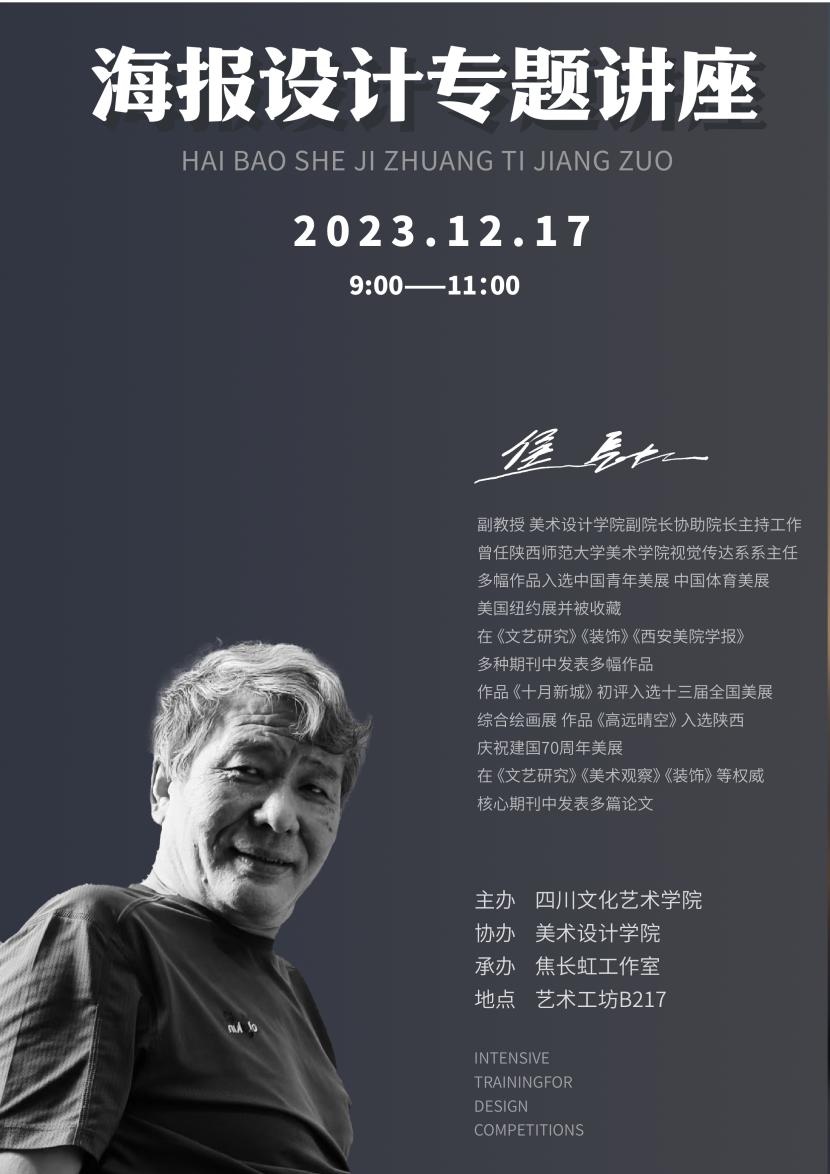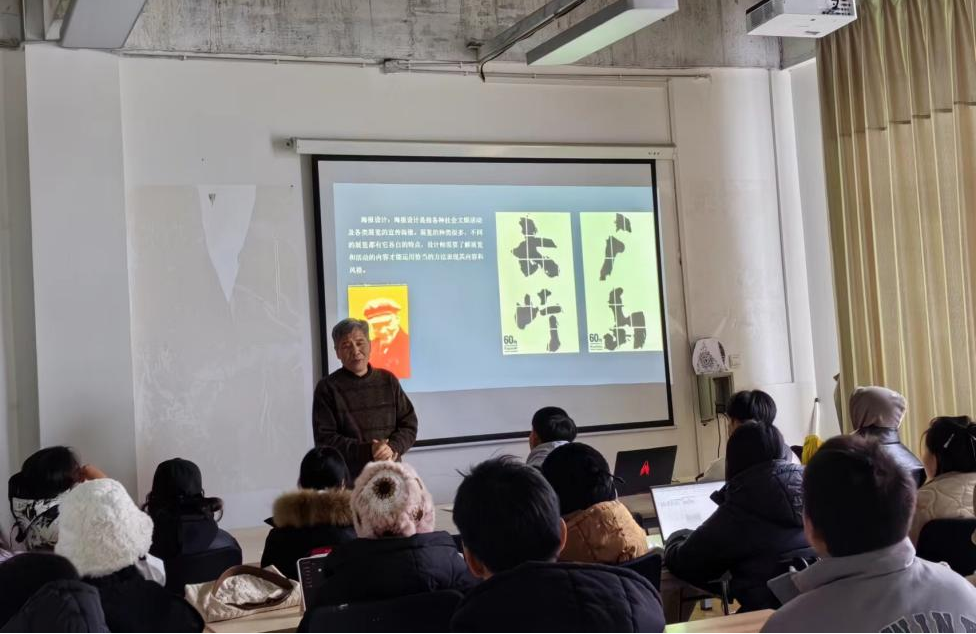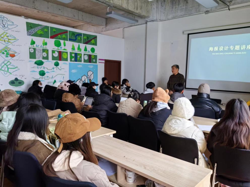 2023年12月17日上午,美术设计学院副院长焦长虹在艺术水街-S15-205开展“海报设计”专题讲座,并与学院师生就海报设计相关理论知识实践案例等方面进行了深入交流。