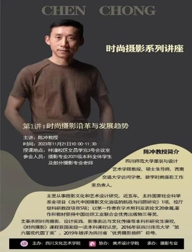 为帮助学生开阔眼界、提升摄影思维能力和创作水平,了解摄影发展前景,营造良好的学习氛围,20231121日我院摄影专业邀请四川师范大学教授、硕士生导师、中国高等教育ssss学会摄影专业委员会理事、四川省教育摄影协会常务理事、副秘书长陈冲在文昌学宫三号会议室开展时尚摄影沿革与发展趋势主题讲座。此次专题系列讲座共分四次进行,摄影专业全体教师及学生代表参加讲座。本次讲座由我院摄影专业负责人朱森教授主持。