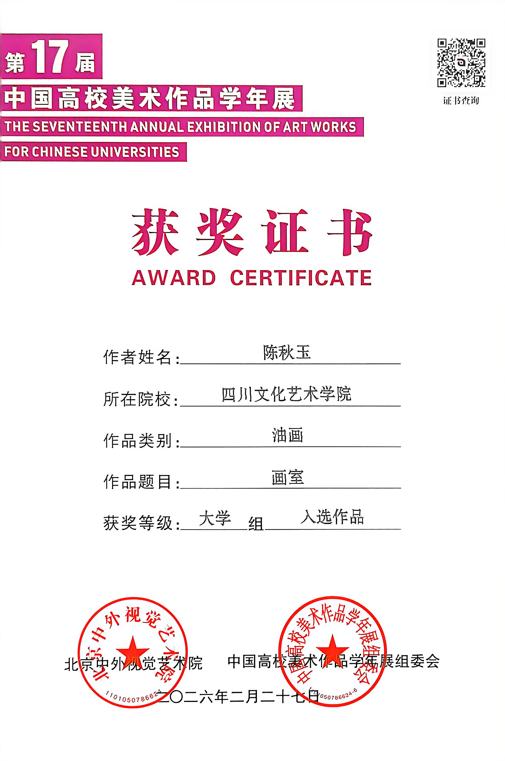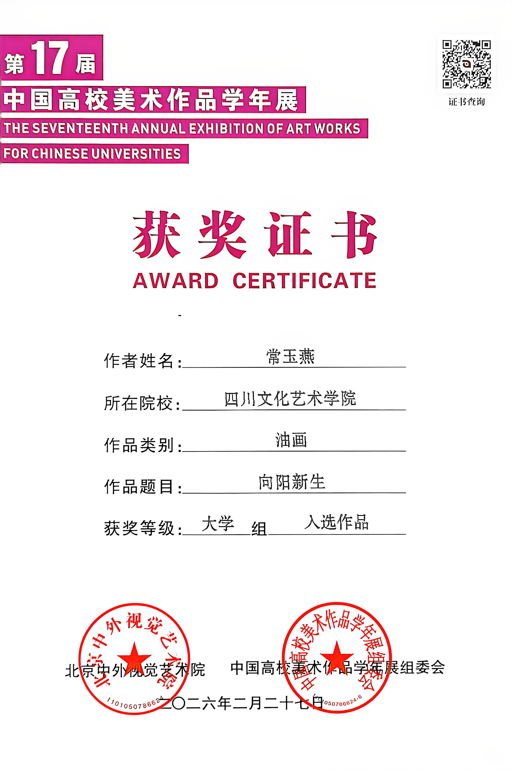 据悉,本次获奖与入选作品将收录于年内正式出版的《第十七届中国高校美术作品学年展作品集》,同时被中国知网全文收录检索,并赠书于获奖作者,实现学术成果权威留存与广泛传播。