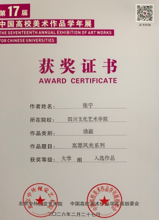本届赛事由北京中外视觉艺术院、中国高校美术作品学年展组委会主办,中外美术研究院和中外设计研究院联办,并由北京中外视觉艺术院成都研究院承办,共收到全国高校有效稿件4861份。经过严格初评、复评、终评,最终入选率仅16%,一、二、三等奖获奖率仅7%,竞争激烈、含金量十足。美术学院罗仕福老师的油画作品《那达慕之二》获得教师组“三等奖”,张翊老师的学术论文《三星堆-金沙古蜀文明对当代中国文艺想象力的重构与现象级激活》获得“三等奖”;罗仕福老师指导的2022级学生黎金梅的毕业创作油画《早上八点》、陈秋玉的毕业创作油画《画室》、常玉燕的毕业创作油画《向阳新生》等成功入选,张翊老师指导的2022级学生张宁的油画《高原风光系列》、2023级学生吴坦然的油画《窗外》等成功入选;两位教师均获得该展览“优秀指导教师奖”,同时美术学院荣获“团体三等奖”,充分展现了美术学院师生深厚的艺术功底和创作实力。