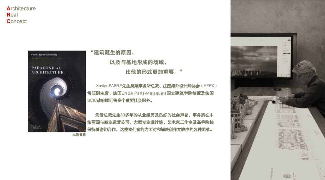 A.R.C. STUDIO,其前身为Xavier FABRE先生 ( 夏维埃 · 法布尔) 和Vincent SPELLER 先生(文森 ·斯贝勒) 自1986年创建的Fabre/SpellerArchitectes 建筑设计事务所,事务所法国总部分别位于“艺术之都”巴黎(Paris)和“米其林之家”克莱蒙费朗(Clermont - Ferrand)。
